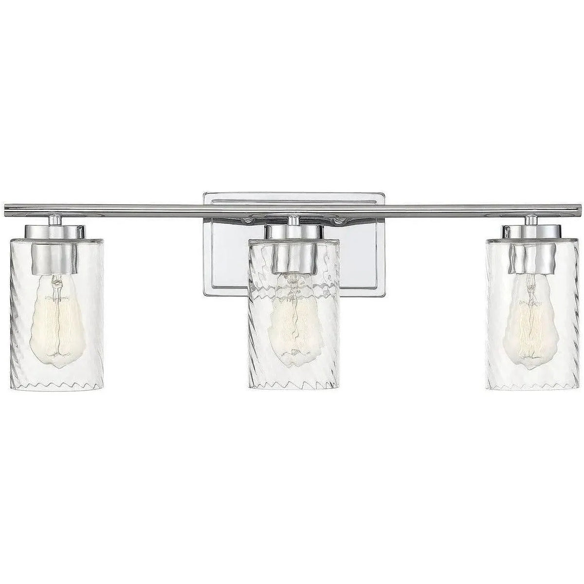 Refined three-light bath bar designed for contemporary interiors. The Meridian Three Light Bath Bar from Meridian Lite Trends pairs a streamlined metal arm and circular backplate with three clear strié glass shades for a clean, sculptural silhouette that softens glare while showcasing exposed bulbs—ideal for designer lighting schemes that demand both form and function.