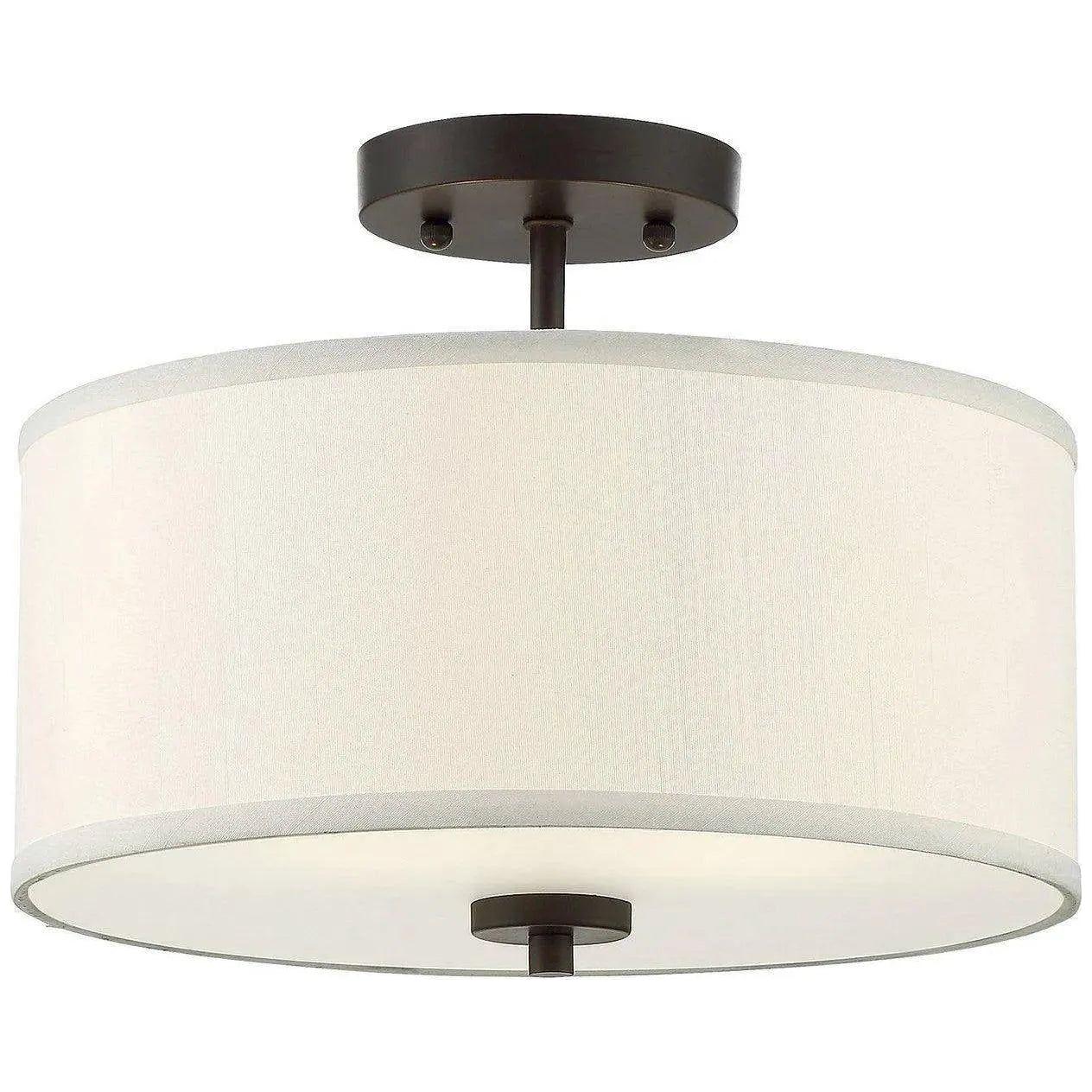 Meridian Lite Trends presents a refined two-light semi-flush mount that balances clean form with material integrity. A crisp white fabric drum shade softens illumination while the brushed nickel canopy and stem provide a restrained, contemporary silhouette ideal for elevated interiors.