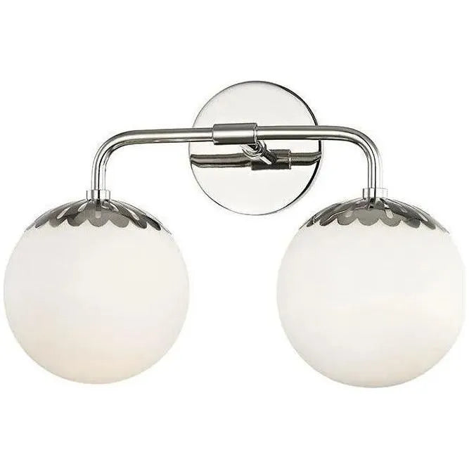 Paige Bath Bracket by Mitzi — a refined wall sconce that balances sculptural form with functional clarity. The matte brass backplate and subtly curved arm deliver a clean, modern silhouette while the scalloped metal collar provides a considered, artisanal accent to the opal glass globe.