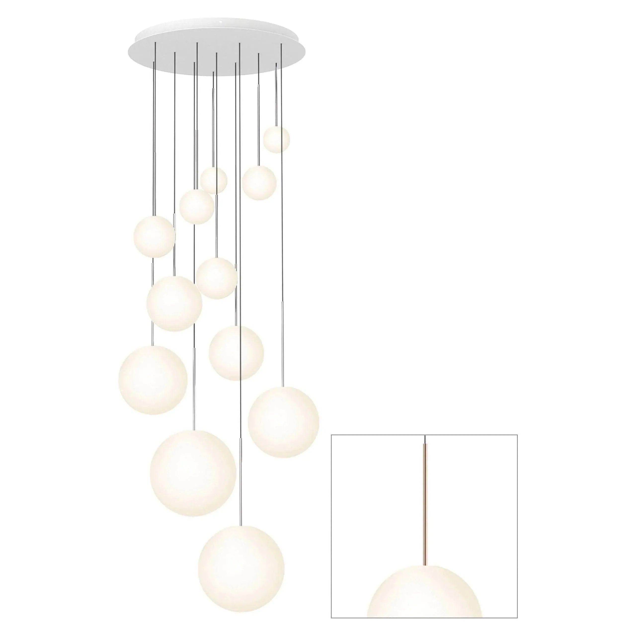 8" (20cm), 10" (25.5cm), and 12" (30.5cm). Its mating base is available in 3 corresponding diameters: 9.5" (24cm), 12" (30.5cm), and 14" (36cm) in 5 exquisite finishes: chrome, brass, rose gold, gunmetal, and matte black. Each finish provides a distinct personality for any residential, contract, or hospitality environment.