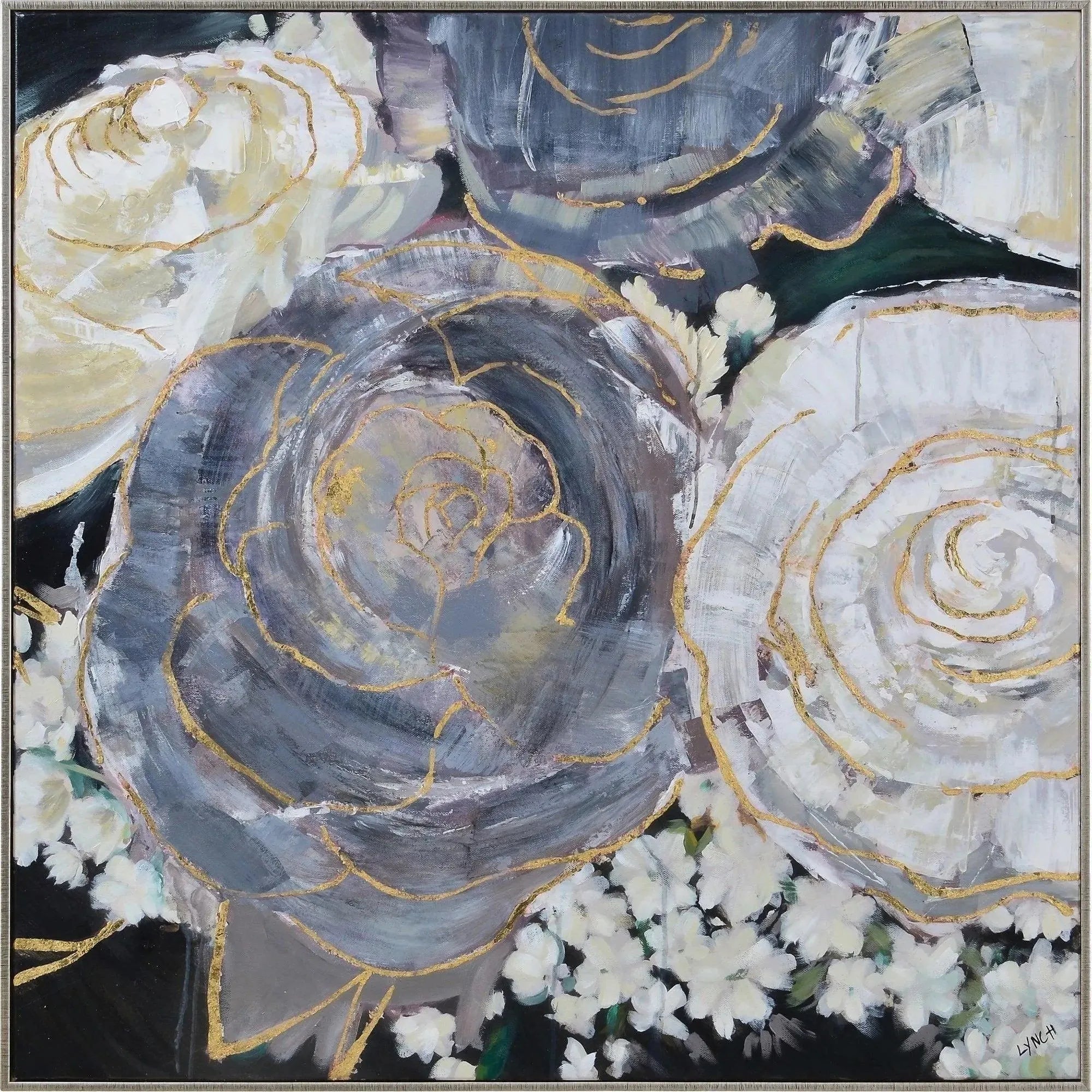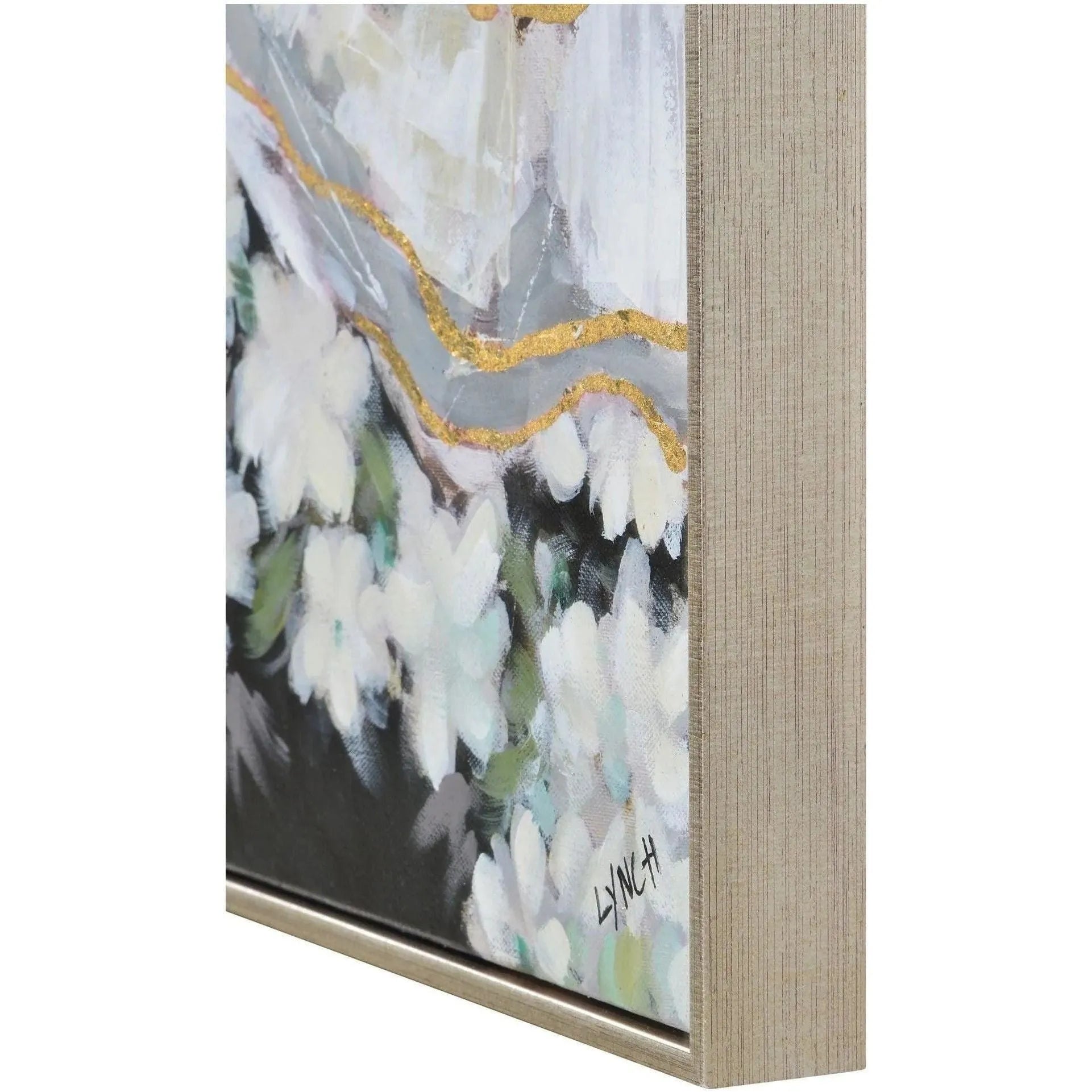 The standard floral painting takes on a creative, luxe quality in this framed oil painting. Featuring a mix of dark and light tones, print and hand painted work, it proves there is great beauty in contrast. Set in the contemporary dining room, this piece will always be in the spotlight.