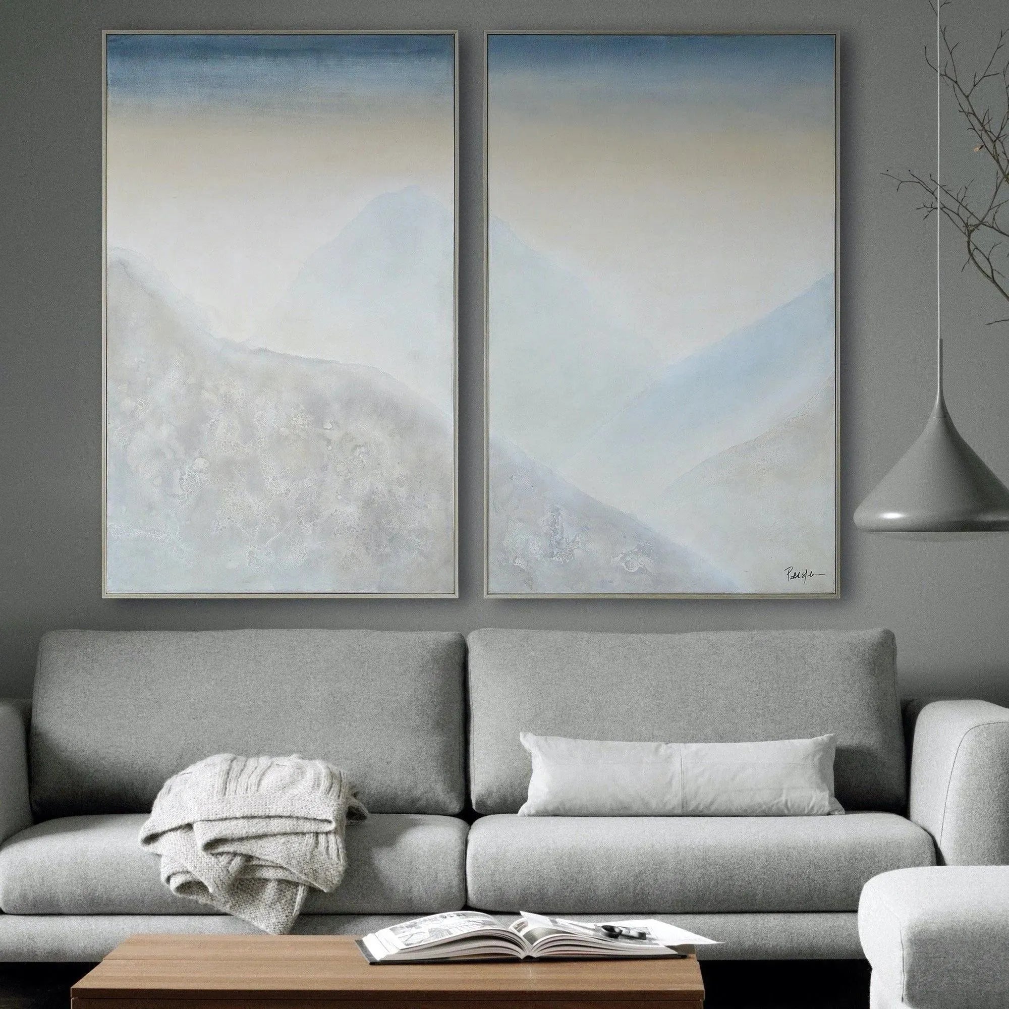 The serenity of mountain views. This pair of hand painted canvases offer a relaxing feel to a busy home. The soft colours and breath-taking view make you pause for a beat and take it all in. The champagne silver frame accents the artwork and sets the tone for a peaceful day ahead.