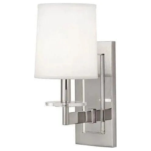 Alice Wall Sconce by Robert Abbey — a refined study in form and finish that elevates corridors, bedside walls, and reception areas with quiet luxury. The design pairs a clean rectangular backplate and single arm in a warm antique-brass finish with a clear lucite accent and a soft pearl dupioni fabric shade for controlled, flattering illumination.