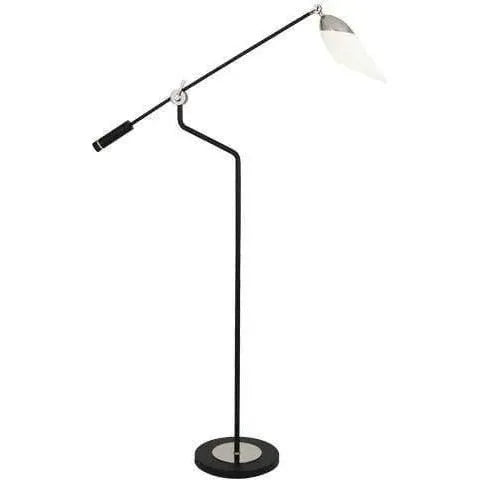 Ferdinand Floor Lamp by Robert Abbey is a study in refined balance—an articulated reading lamp that combines sculptural line with purposeful task illumination. The slender black stem and angled arm are punctuated by brass accents and a soft white, leaf‑like shade that directs warm, glare‑controlled light where you need it.