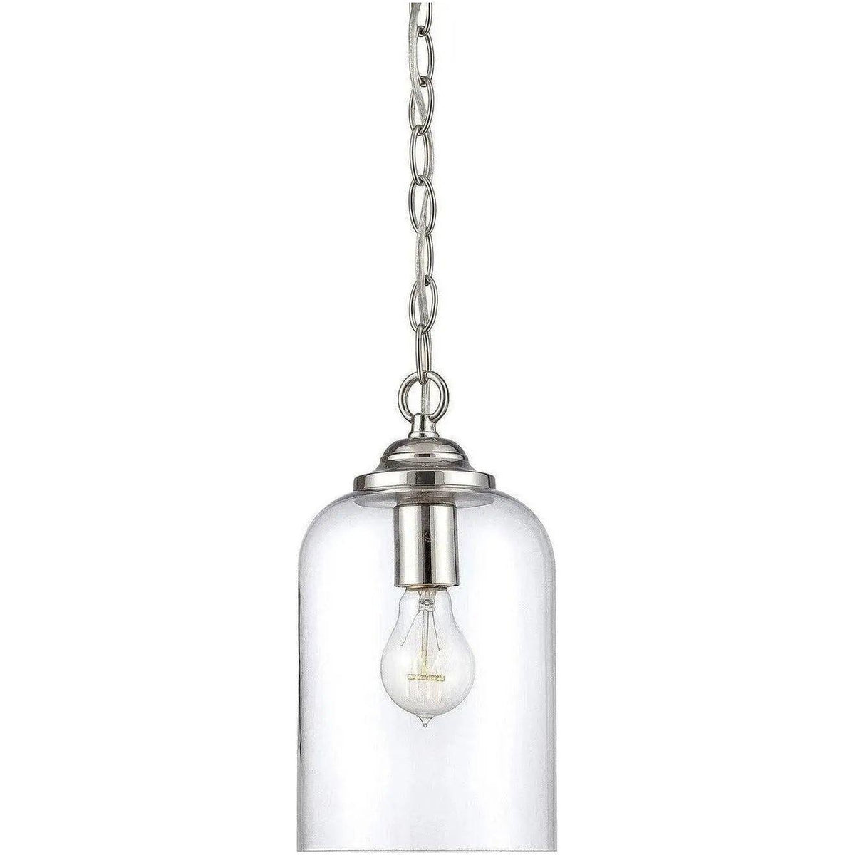 This Savoy House Bally 1-light pendant is designed to perfectly adorn any space with a clear glass shade and a polished nickel finish. Pendants are extremely versatile and can fit in many different spaces, such as kitchens, family rooms, great rooms, foyers, entryways, offices, bedrooms and bathrooms. Because this pendant is chain-hung, you can use as much or as little chain as you need to fit your specific hanging height needs, and this pendant can be used on a sloped ceiling. Since the bulb is exposed, try using a stylized bulb (not included) like Edison style for a different twist! The polished nickel finish can be paired with nickel hardware or mixed with hardware in other finishes. Bally is a perfect addition to rooms of any style. When you choose a Savoy House lighting fixture, you can be certain you've selected a piece that will withstand the test of time.
