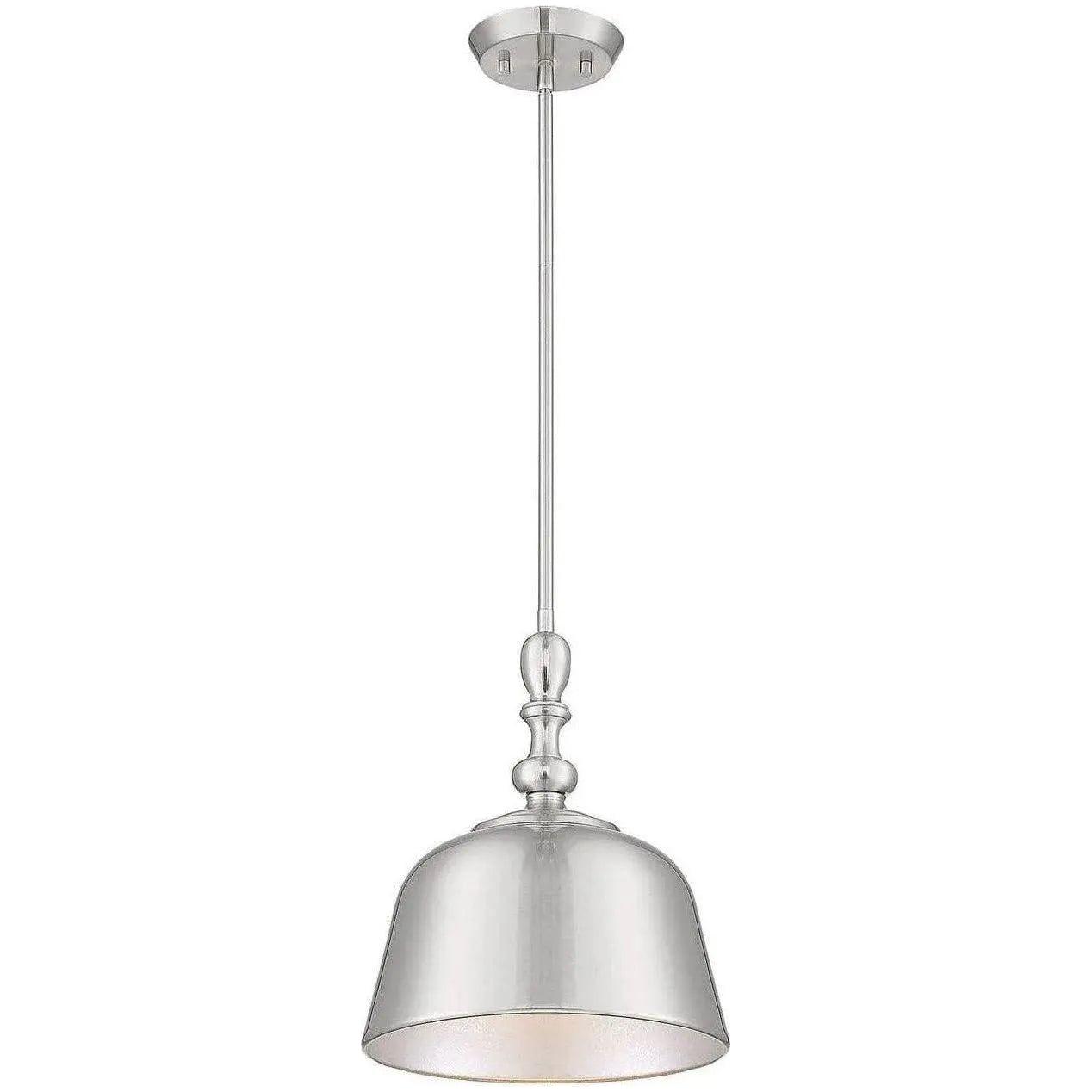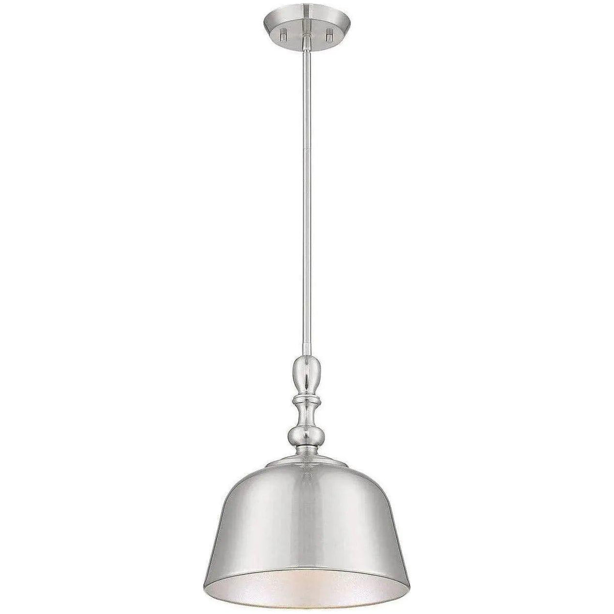 This Savoy House Berg 1-light pendant perfectly blends bold industrial style with a touch of traditional allure. Itoffers an oversized metal shade that isfinished in polished nickel, both inside and out, for a bright, focused glow. Above the shade, hardware details recall the curves of an elegant candlestick. The Berg pendant is perfect for applications where you would like a more directed beam of light, like over a kitchen island. This fixture is 12" in width and has an adjustable height that ranges from 14" to 45.5". Uses one standard size light bulb of up to 60 watts (not included).