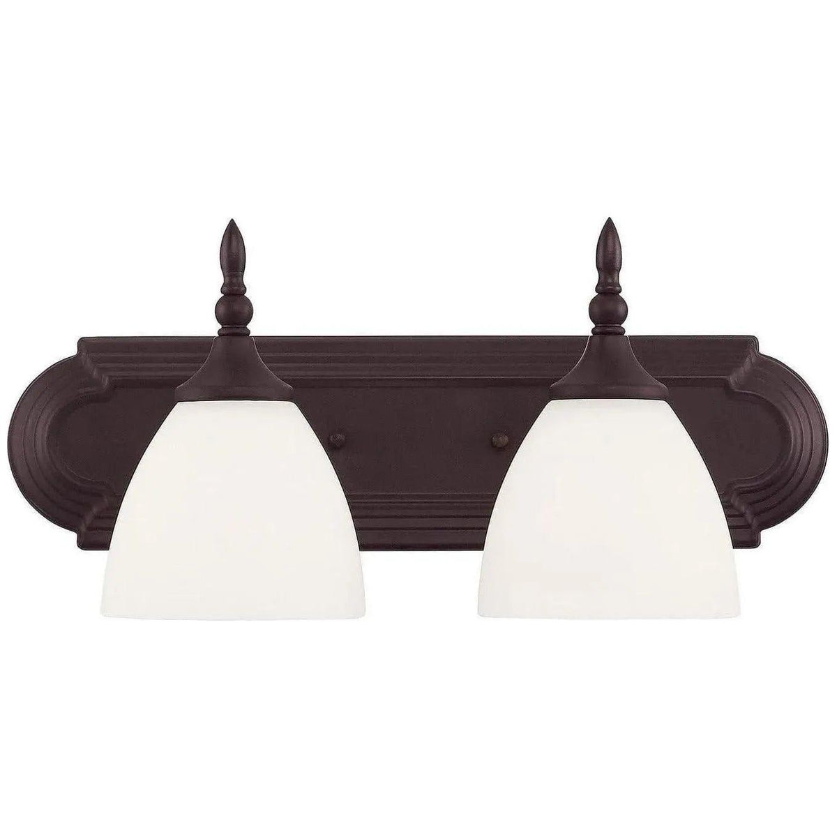 Great lighting is a key piece of excellent home design, and the Herndon bath bar is a solution to that puzzle! The rich, dark English bronze is a timeless finish. And streamlined, finely crafted details —like the ball and cone finials and the wonderful, outlined wall plate— create a clean, classic design that looks terrific. The style is familiar and pleasant, which sets a serene and relaxed mood. Graceful arched light arms have smooth, white glass shades, and two 60W, E-style bulbs provide ample, flattering light, ensuring you and your guests are comfortable. This fixture is 18" wide, 8" high, and may be mounted as uplight or downlight: a stylish fixture with casual elegance for your bathroom or powder room.