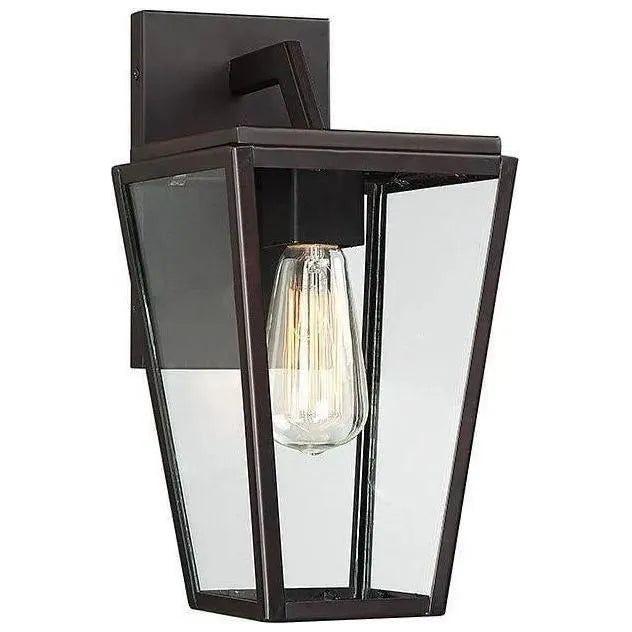 Sleek, contemporary, and welcoming light is all yours with the Milton outdoor wall lantern. It's a fresh, modern take on a classic, tapered-box lantern, with clean lines and an angular, geometric silhouette. The streamlined frame has a rich, dark, English bronze finish, and pristine, clear glass panes. It's an impeccable complement to other hardware and materials on the exterior of your home. Within the lantern panels, one 60W, E-style bulb illuminates the area —and this fixture is UL rated for damp locations, too. It measures 6.5" wide and 13" high, extending 8" from the wall: perfect to add chic lighting to the walls of your patio, porch, sunroom, or other covered outdoor living areas.