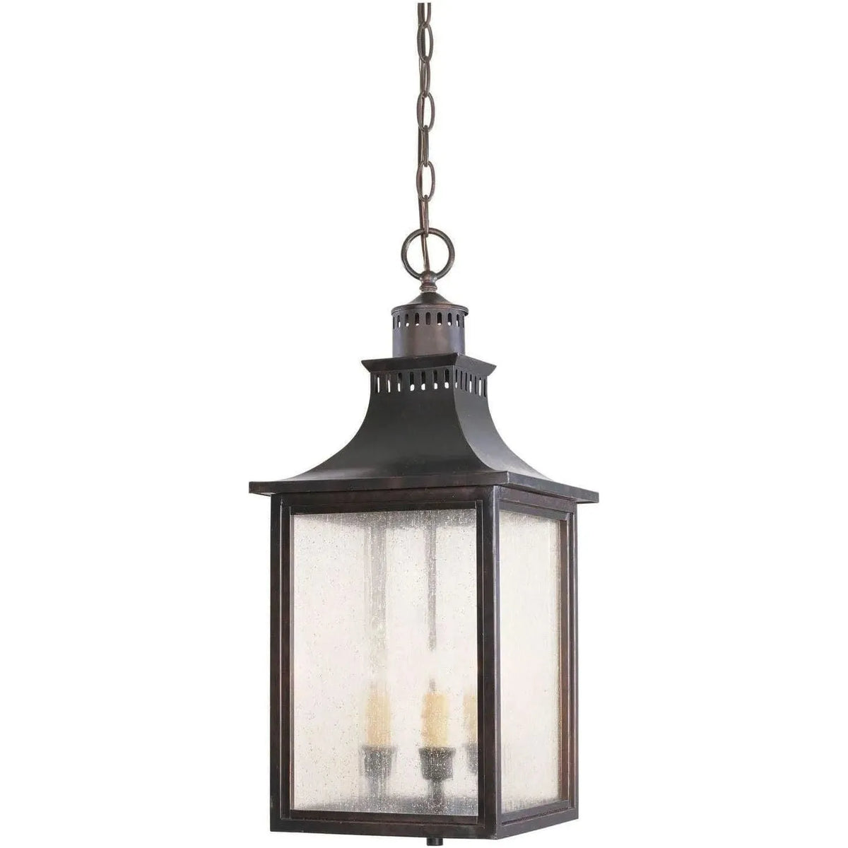 The Monte Grande is an elegant, clean-lined version of a classic, box-shaped lantern. It's a timeless and pleasing style from designer Karyl Pierce Paxton —a hanging lantern that will not only illuminate the exterior of your home, it will welcome you and your guests with a familiar, traditional aesthetic. The English bronze finish is a wonderful neutral that goes with other hardware and architectural materials. And the panels are made of beautiful, pale cream, seeded glass. Three cream-colored, drip candle covers add to the vintage charm, and hold 40W, C-style bulbs for plenty of soft light. This lantern is 10" wide, 22.5" high, and UL rated for damp locations: perfect for your porch, patio, sunroom, pergola, and other covered outdoor living areas.