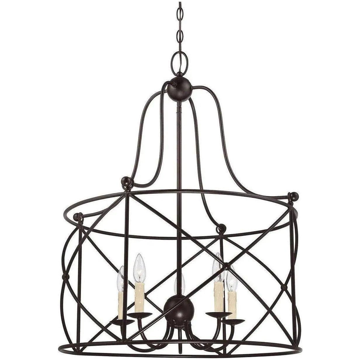 The Seneca pendant sports an open, airy frame with an elegant, birdcage-like design. Slim, curved metal bars swoop down from the globe canopy to crisscross around the main drum-shaped frame. The central column suspends an inner, candelabra structure, with five curved light arms, simple candle cups, and a globe finial —all with a rich, dark, English bronze finish. Each of the five light arms has a lovely, pale cream beeswax candle cover, and each holds a 60W, C-style bulb for plenty of illumination through the open frame. This pendant is 25.5" wide and 32.5" high: a superb size to put clean, casual style in your dining room, kitchen, foyer, family room, office, bedroom, great room, or stairway.