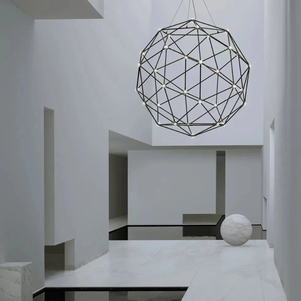 The integrated LED nodes at each intersection deliver balanced, energy-efficient light while preserving visual transparency. Meticulous craftsmanship and a refined metal finish ensure durability and a premium presence above dining tables, foyers, or collaborative workspaces.