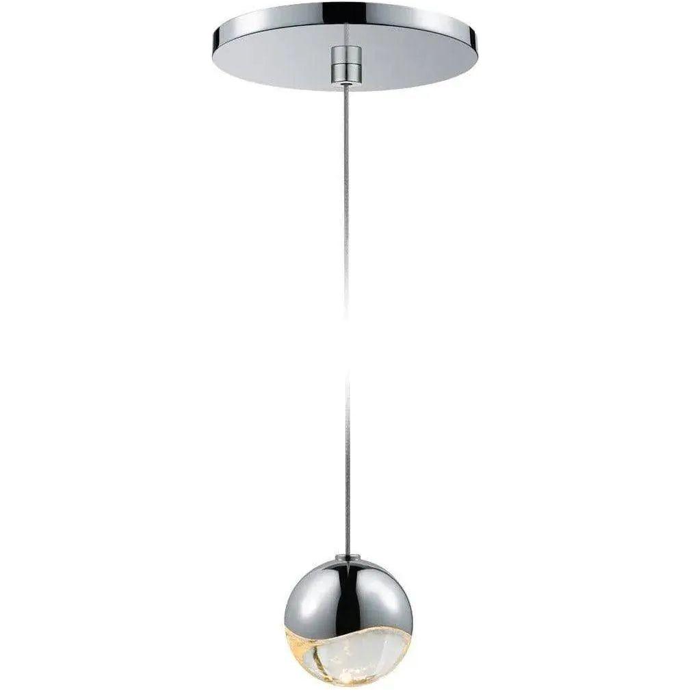 Sonneman Grapes LED Pendant — a sculptural, modern lighting statement that balances mirror-polished metal with hand-formed glass. The hemispherical chrome canopy and reflective upper shell transition into a textured, organic glass lower half, producing a refined glow ideal for curated interiors.