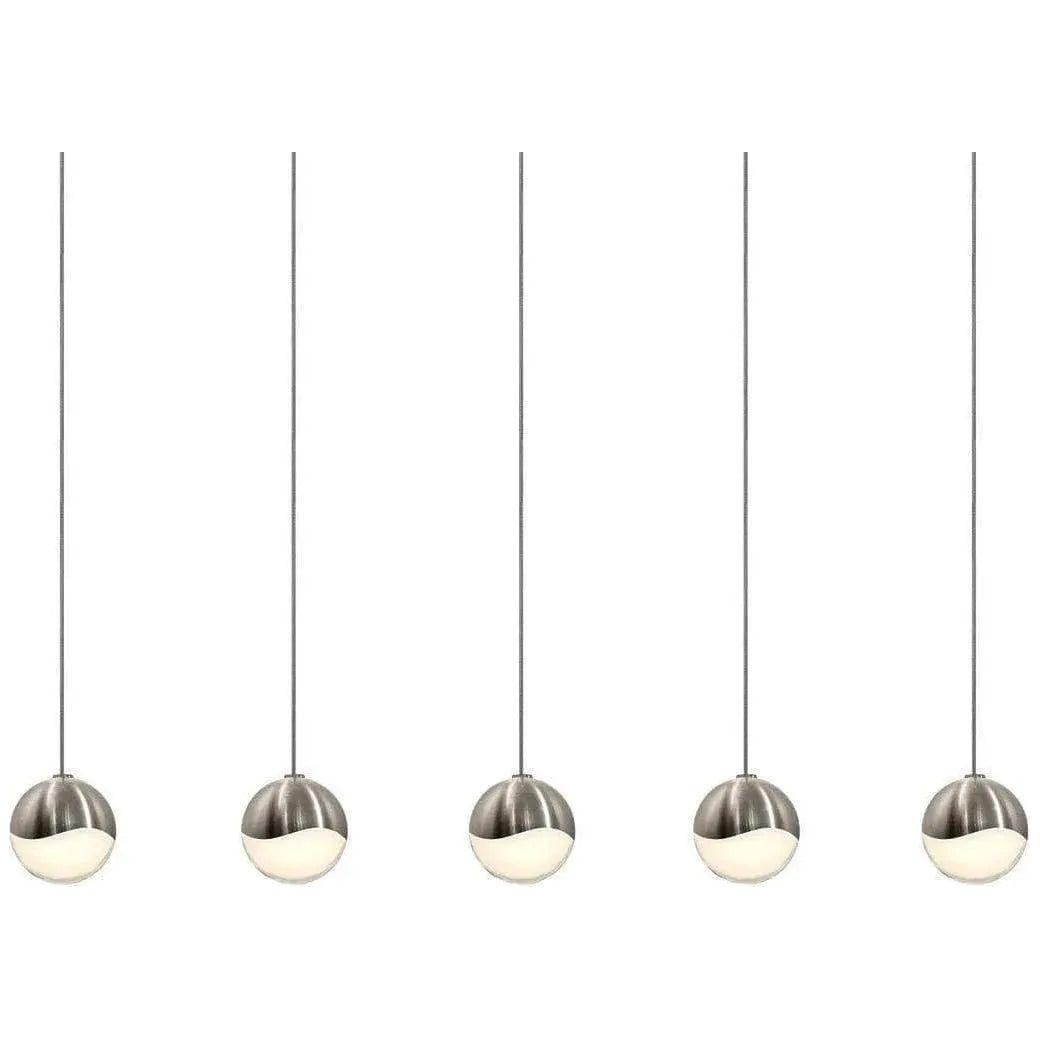 Sonneman Grapes LED Pendant — a considered study in form and light that reads as sculpture and delivers practical illumination. The polished chrome globe is sliced to reveal a textured, molten-glass lower hemisphere that refracts a warm LED glow, creating depth and subtle sparkle in curated interiors.