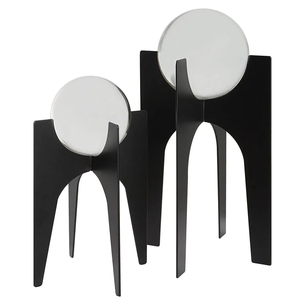 Crystal Spheres Elevated On Iron Bases Finished In A Brushed Black. Sizes: S-6x10x6, L-7x16x7