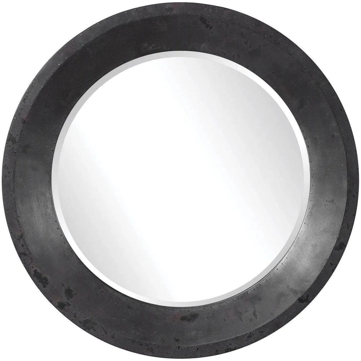 Showcasing An Industrial Style, This Round Mirror Is Paired With An Oxidized Metal Frame In Dark Gray, Silver, Charcoal, And Rust Tones With Nail Accents. A Generous 1 1/4" Bevel Completes This Piece.