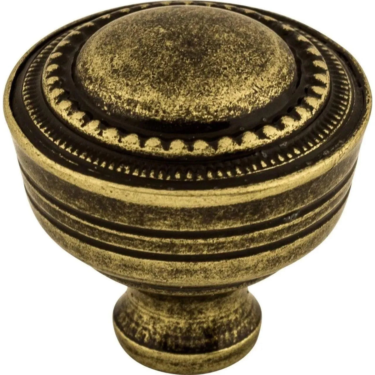 The knob features precision-machined metalwork with an antiqued surface and intentional wear marks that emphasize artisanal finish and durable construction. Its substantial feel and compact footprint make it a designer lighting–friendly choice for kitchens, baths, built-ins, and hospitality interiors.