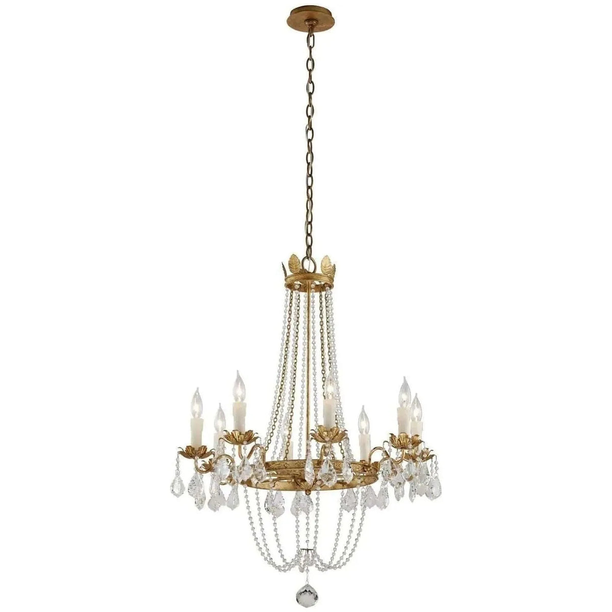 Viola Chandelier by Troy Lighting—a considered pendant that pairs classical proportion with modern craft. Hand-worked iron finished in distressed gold leaf and strung with clear Venetian glass beads, it delivers refined ambient light and tactile richness for elevated interiors.